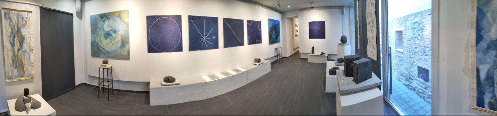 Loredana Müller, cura-allestisce l’esposizione; espone tre teleri di antico cotone e due quadri quadrati di un lino dell’Ottocento, lenzuoli degli avi, e piccole tele unitamente a plaquette a tema. La particolarità sta nel suo costruirsi i colori, che giungono come eco di ossidi minerali e materiali che ci abitano. Compongono i quattro elementi per lei tensioni spirituali, e di fatto energie primarie inscindibili. Acqua, aria, fuoco, terra… e quella luce delle “Voci minerali”, “Mitologema”, “Finestre sul silenzio dei mari” sono i suoi temi.