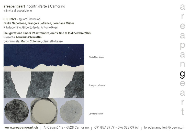 SILENZI – sguardi incrociati – 3 artisti visivi e 3 poeti è il titolo dell’esposizione che, a cura di Loredana Müller, s’inaugura oggi, 29 settembre, alle ore 19, all’Areapangeart (ai Casgnò 11a, Camorino). Terminerà il 15 dicembre. Un’esposizione che, in questo momento particolarmente drammatico, tocca il tema del silenzio, nelle arti visive e nella poesia. Tra carte a pastello di Giulia Napoleone, sculture in pietra di François Lafranca e tele-teleri di Loredana Müller, prendono corpo e presenza autori diversi. Nella poesia: Antonio Rossi (Prevale il silenzio), Gilberto Isella (Dove sta il silenzio) e Rita Iacomino (Infanzia). Aleggia in galleria un suggestivo passaggio di Max Picard da Il mondo del silenzio: