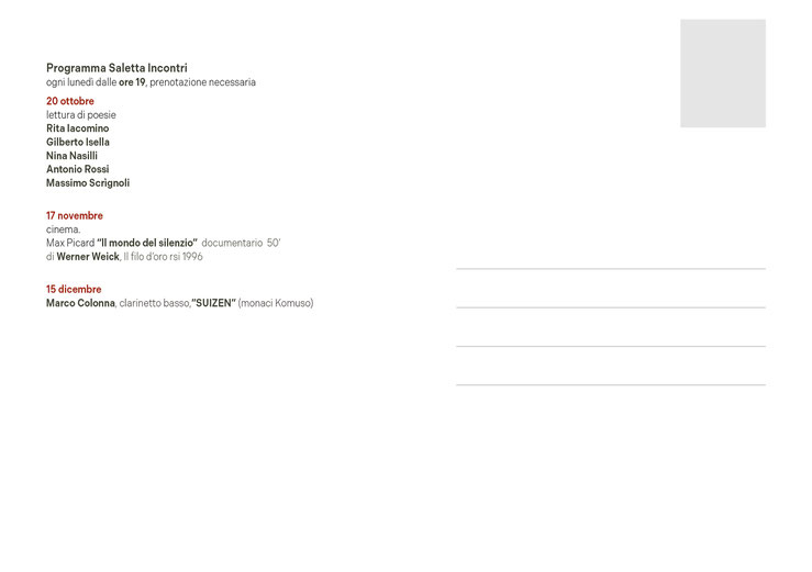 - 20 ottobre. Coinvolti i poeti presenti in sala con i propri testi: Rita Iacomino, Gilberto Isella e Antonio Rossi. Inoltre, i poeti per i quaderni grigi Massimo Scrìgnoli e Nina Nasilli; per le minute plaquette esposte, e nate sempre sul tema dei silenzi, Marco Vitale e Alessandro Margnetti.