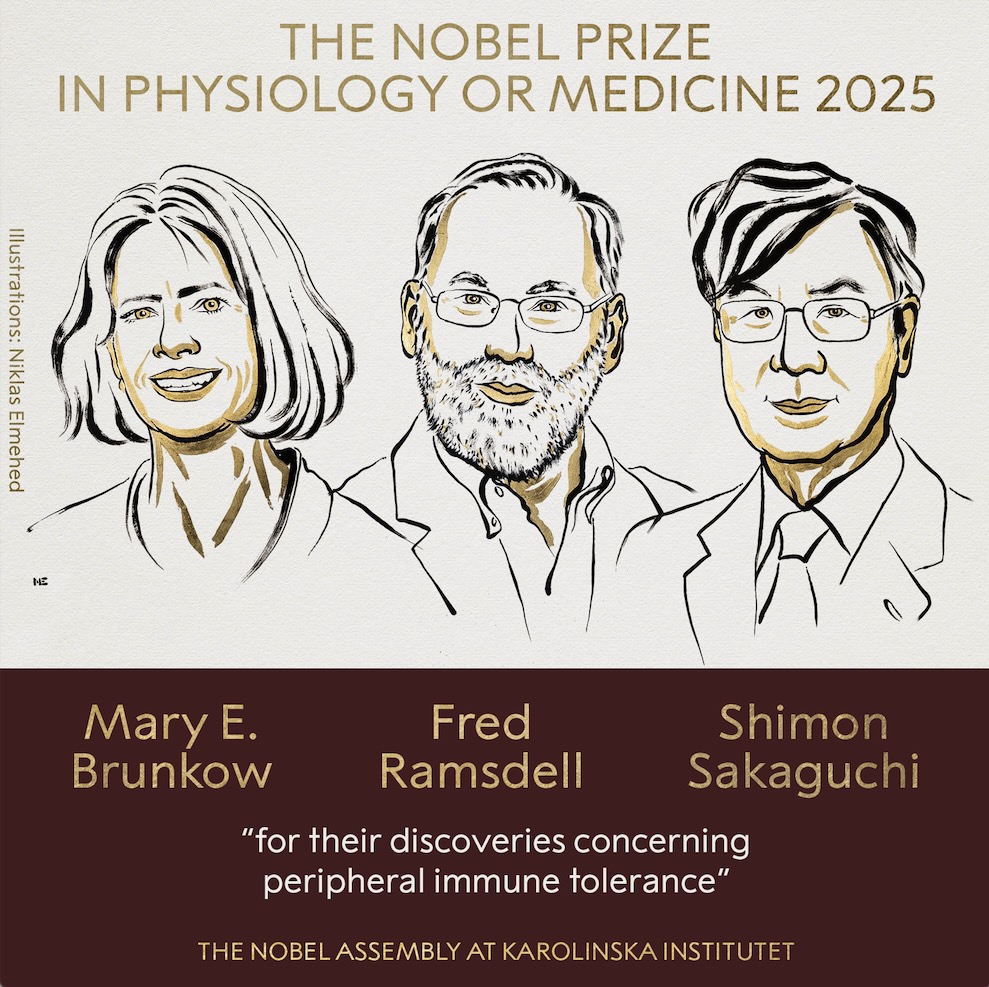 Il Comitato Nobel del Karolinska Institutet ha assegnato il Premio Nobel per la Fisiologia o la Medicina 2025 a Mary E. Brunkow, Fred Ramsdell e Shimon Sakaguchi per le loro scoperte sul meccanismo della tolleranza immunitaria periferica, che impedisce al sistema immunitario di attaccare il proprio corpo.