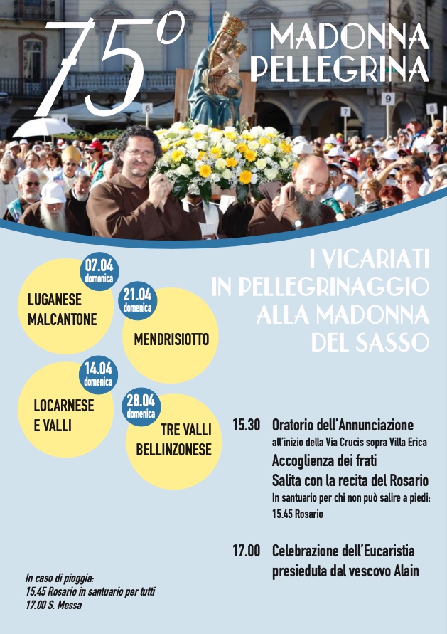 Ogni domenica ciascun Vicariato è invitato a partecipare a un piccolo pellegrinaggio, che partirà alle ore 15.30 dalla cappella dell’Annunciazione, all’inizio della Via Crucis che conduce al Santuario di Orselina. Durante la salita sarà recitato il Santo Rosario. Per coloro impossibilitati a camminare, il ritrovo è presso la chiesa del Santuario alle ore 15.45, sempre per la recita del Santo Rosario. In seguito, alle ore 17.00 ci sarà la celebrazione della Santa Messa presieduta durante tutte le quattro domeniche dall’Amministratore apostolico mons. Alain de Raemy e predicata da Fra Mauro Jöhri, Custode dei Cappuccini della Svizzera italiana. In caso di pioggia, si svolgerà tutto in chiesa a partire dalle ore 15.45.