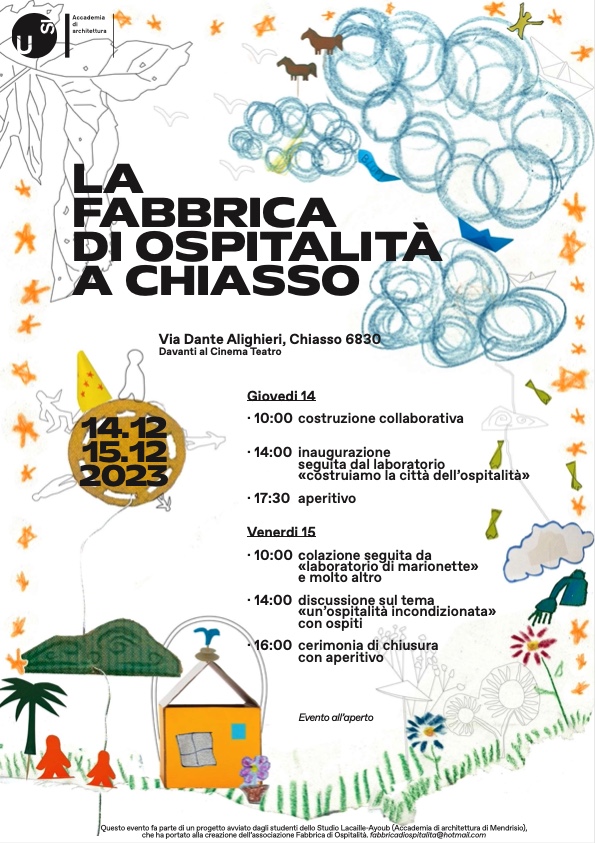 Giovedì 14 e venerdì 15 dicembre si terrà a Chiasso – in via Dante Alighieri, davanti al Cinema Teatro – l’evento conclusivo del progetto di ricerca condotto dagli studenti dell’Accademia di architettura di Mendrisio sul tema dell’ospitalità e, più in particolare, sull’accoglienza dei richiedenti asilo in Ticino.