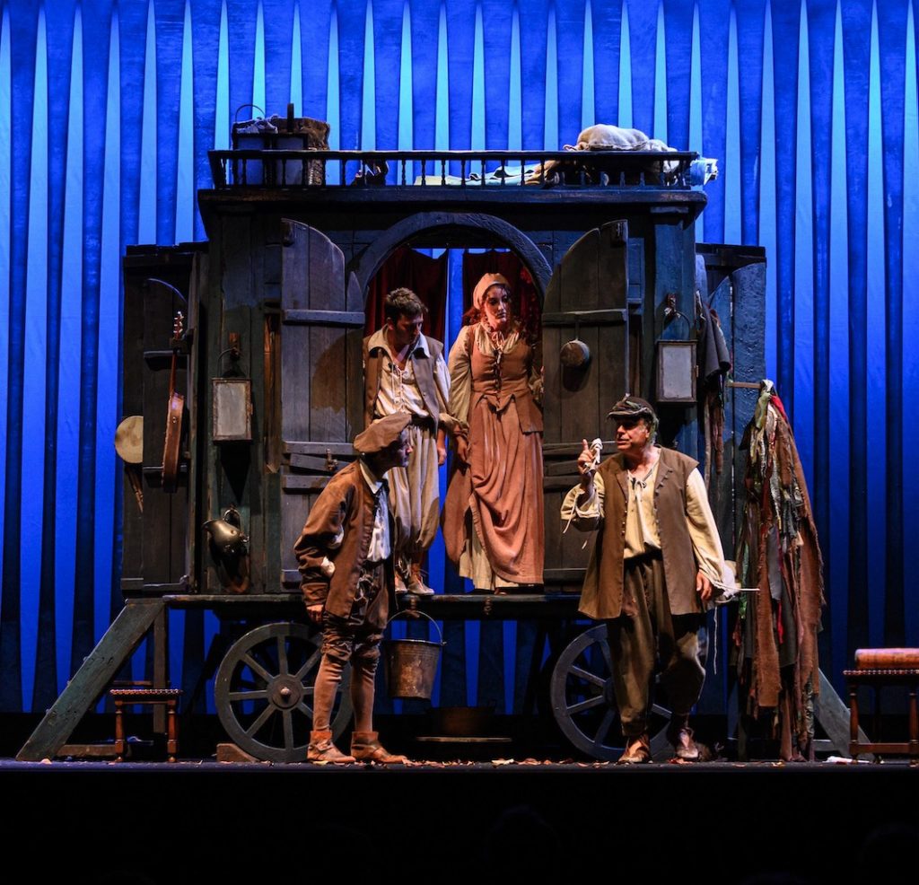 È un viaggio nel teatro, quello di Molière in primo luogo, ma non soltanto… È anche un viaggio nel tempo, quello del Seicento, un secolo pieno di guerre, epidemie, grandi tragedie ma anche di profonde intuizioni e illuminazioni che non riguardano solo quel tempo. Ed è anche il viaggio, reale e immaginario, di Oreste Bruno e la sua Compagnia di famiglia, quella dei Fratelli dè Bruno da Nola (discendenti del grande filosofo Giordano Bruno), una vera “carretta dei comici” viaggiante, tanto cara sia a Peppino che a Luigi De Filippo. Lungo il percorso, quando “la Compagnia” arriva nei pressi di un centro abitato, di un mercato o di un assembramento di persone, ecco che il “carretto viaggiante” diventa palcoscenico e “si fa il Teatro”. E col “teatro” si riesce anche a mangiare, quasi sempre. Infatti, grazie agli stratagemmi di tutti i componenti della famiglia teatrale si rimedia il pasto quotidiano o qualche misera offerta in monete o, più spesso, qualche pezzo di animale, già cucinato, offerto come compenso della esibizione sul palco-carretto delle opere di Molière (L’Avaro e il Malato Immaginario sono “i cavalli di battaglia” di cui vengono proposti i momenti salienti, opportunamente adattati al luogo e agli astanti).