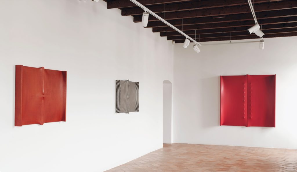 Sala allestita al Museo d’arte di Mendrisio con le opere di Enrico Castellani: Superficie rossa, Superficie rigata bianca e blu, Dittico rosso.