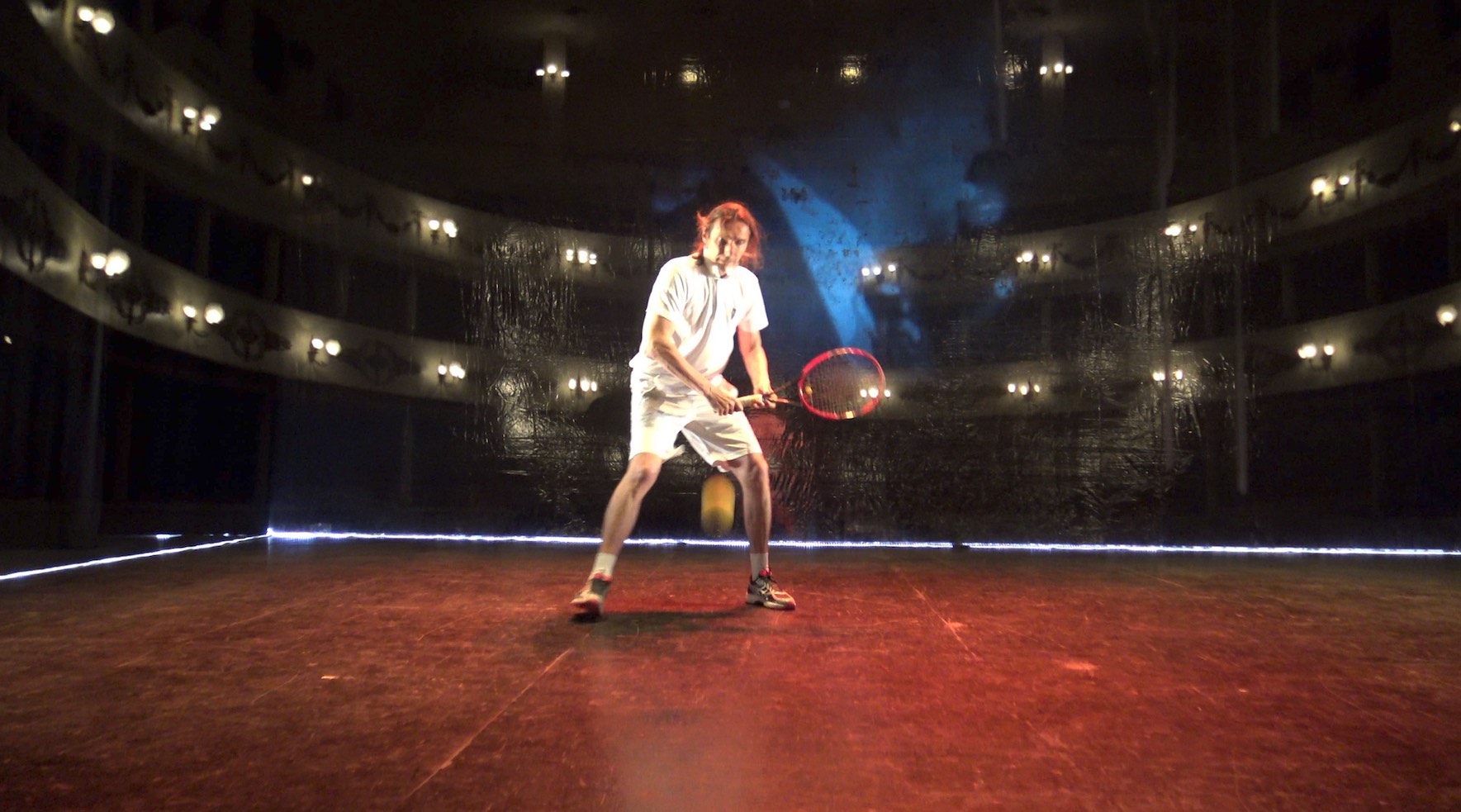 Max, il protagonista, affronta la crisi della sua vita come ha sempre fatto: giocando a tennis. Per un’ora sul palcoscenico Max si getta in una performance tennistica che lo porta allo sfinimento fisico quanto mentale delirando, lui che è sposato, sull’amore per una donna di cui si è innamorato. Il muro trasparente (una parete di plexiglass) che separa il giocatore dal mondo esterno, diventa metafora di una condizione esistenziale nella quale è facile riconoscere l’isolamento cui siamo stati costretti tutti da un giocatore invisibile del quale è difficile prevedere le mosse. In un crescendo di rabbia e di potenza nei colpi che rintronano in platea, un metafisico coup de théâtre finale più che mai eleva il tennis a metafora della vita. Paolo Valerio, già tennista di un certo valore, è l’interprete di uno spettacolo particolarissimo, in cui il pubblico ascolta le riflessioni e le parole dell’attore in cuffia e che alla fine dello spettacolo sul palcoscenico potrà giocare a tennis con lui.