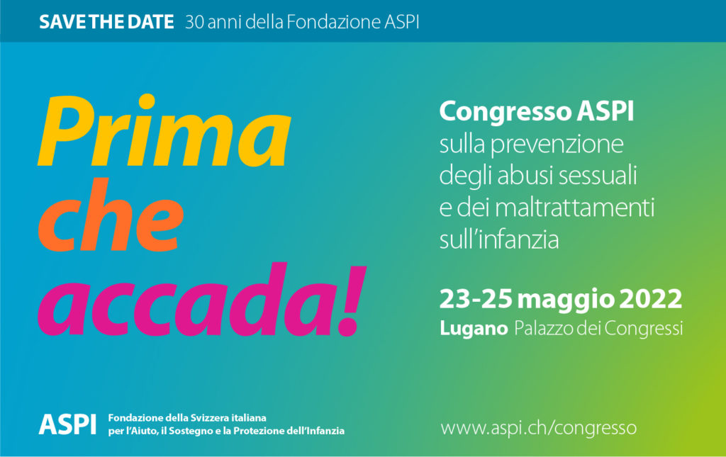 Per celebrare il 30° anniversario dalla sua nascita, la Fondazione ASPI – Fondazione della Svizzera italiana per l’Aiuto, il Sostegno e la Protezione dell’Infanzia – organizza dal 23 al 25 maggio 2022, presso il Palazzo dei Congressi di Lugano, il terzo Congresso internazionale sulla prevenzione degli abusi e dei maltrattamenti sull’infanzia (0-18 anni), intitolato Prima che accada!. Giorno dopo giorno, si accenderanno i riflettori su un ambito specifico della società: lunedì 23 maggio: politica, istituzioni, media e in generale tutta la società civile; martedì 24 maggio: il tempo extrascolastico, con accento particolare sui settori dello sport, della disabilità e dell’ambito ecclesiastico; mercoledì 25 maggio: scuola e famiglia.