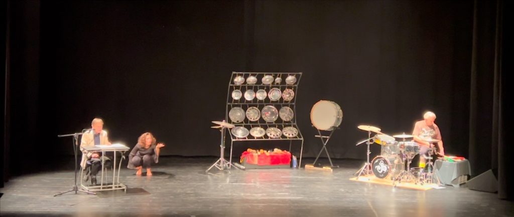 Ieri sera al Teatro Foce di Lugano, davanti ad uno sparuto gruppetto di astanti (un vero peccato) è andato in scena il primo atto di una serie di incontri (come annunciato) proposti dalla Movimart Lagotina, Linguaggi universali, un viaggio sincretico e sinestetico tra suoni, parole e movimento. Le percussioni e altre suggestioni sonore di Ivano Torre che si divide tra gli echi cristallini, squillanti, ora metallici, ora liquidi, della “rastrelliera” di piatti utilizzati come tasti dodecafonici dalle evocazioni mistiche e cerebrali, e le profondità ctonie dagli accenti tribali (che rimbalzano sul cuore) dei tamburi e della batteria, in variazioni ritmiche e vibranti effetti visionari, sciamanici, tali da anticipare, o accompagnare o commentare la parola. La parola è quella di Gilberto Isella che legge da un suo testo inedito, Che fai tu qui? – Confluenze espressive, portandoci in un percorso vertiginoso nelle pieghe poetiche, là dove, dalle origini alla più azzardata avanguardia, la natura (minerale, animale, umana…) è colta nella sua complessità e multimedialità sensoriale.